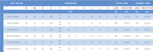 Estos silemblock aguantan cargas de 80 kilogramos en carga estatica y 60 kilos de carga en movimiento, la dureza es de 45 SH.